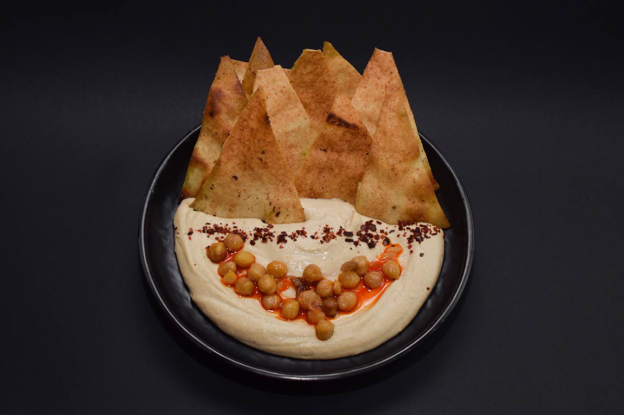 نخود _ ارده _ روغن زیتون _ نان پیتا سرخ شده