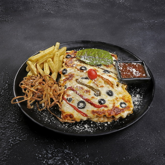 لازانیا ورقه ا ی ,گوشت بلونزه ,پیاز , قارچ,سس بشامل .پنیر موزارلا
